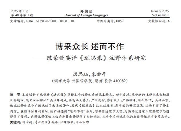 唐思珏、朱健平在《外国语》发文:博采众长 述而不作——陈荣...